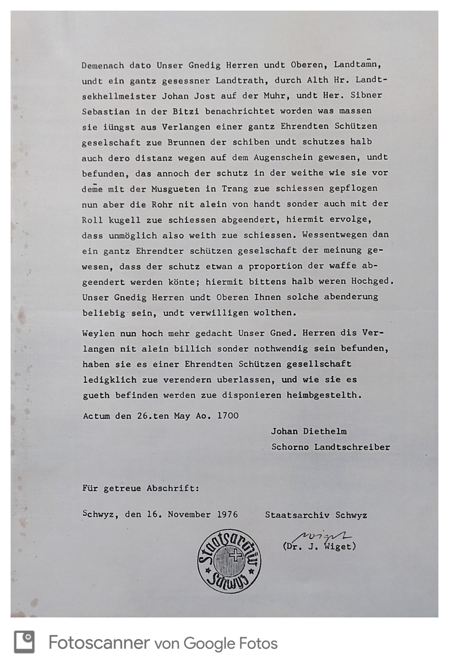 Das folgende Schreiben vom Landschreiber Johan Diethelm Schorno, vom 26. Mai 1700, erwähnt erstmals eine Schützengesellschaft, welche das Schiessen mit der Muskete ausübt. Alleine schon die Sprache aus dieser Zeit macht das Dokument lesenswert…